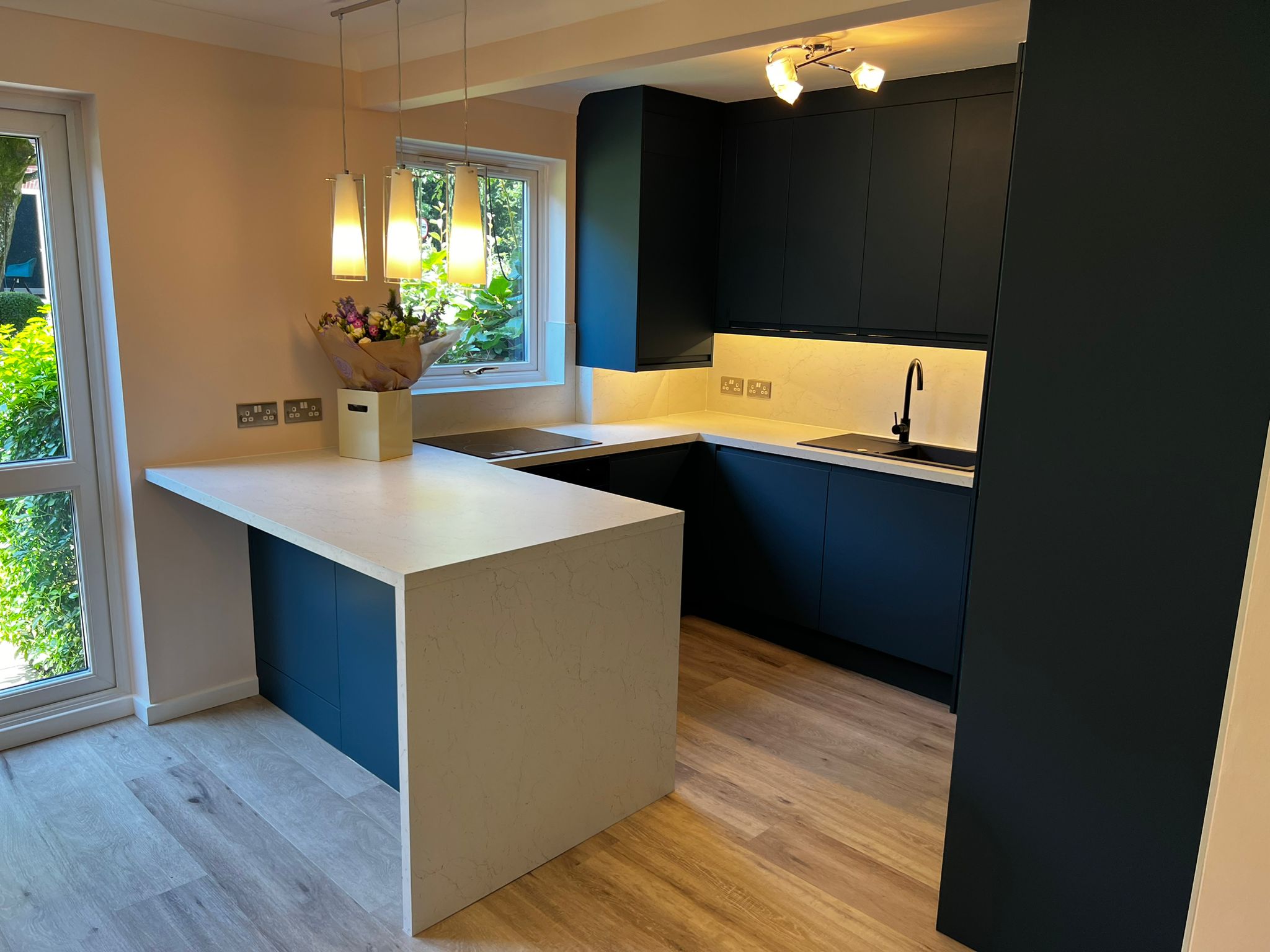 Dark navy blue kitchen with pendant lighting, Elmbridge Village Cranleigh, kitchen fitting Surrey Sussex Thomson Properties